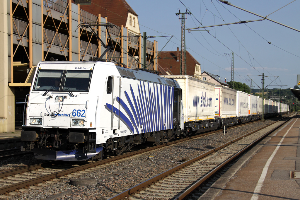 Die Lokomotion 185 662-4 zieht den EKOL von Triest über München Ost nach Ludwigshafen BASF durch Plochingen am 12.07.2013