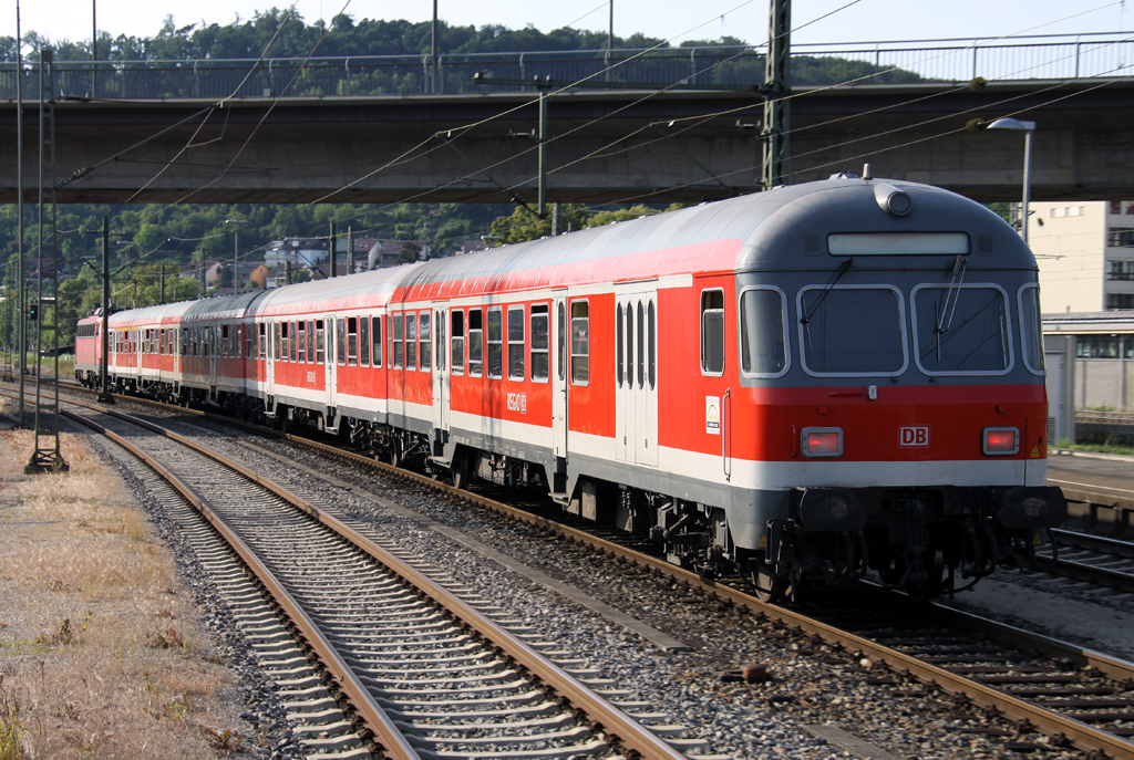 Die Stuttgarter 110 446-2 zieht als aktuell letzter Regio 10er den IRE 3276 und Karlsruher Steuerwagen mit Gepäcktür im TT Umlauf von Tübingen nach Stuttgart durch Plochingen am 12.07.2013