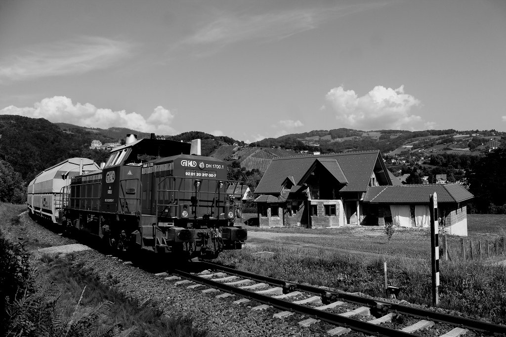 Ein Häuschen ums andere entsteht am Hang neben der Leibenfelder Höhe. Hier im Bild DH1700.1 mit einem Zug voller Perlkies am 19.Juli 2013