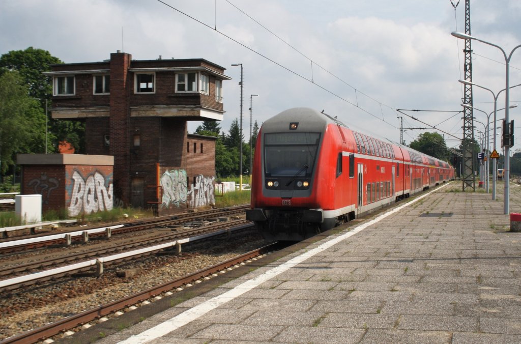 Hier ein RE1 (RE18114) von Eisenhüttenstadt nach Magdeburg Hbf., bei der Einfahrt am 28.6.2013 in Berlin Wannsee.