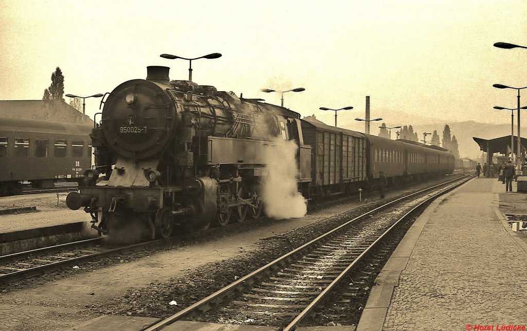 Im Oktober 1978 wartet 95 0025-7 mit einem Personenzug im Bahnhof Saalfeld auf die Abfahrt nach Sonneberg