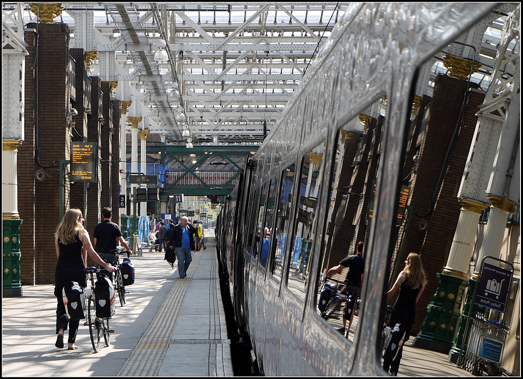 Lichtdurchflutet, aber auch sehr heiß - bei sensationellen 31 Grad! Die Bahnhofshalle von Edinburgh-Waverley mit unserem Zug nach London-King´s Cross. 14.7.2013