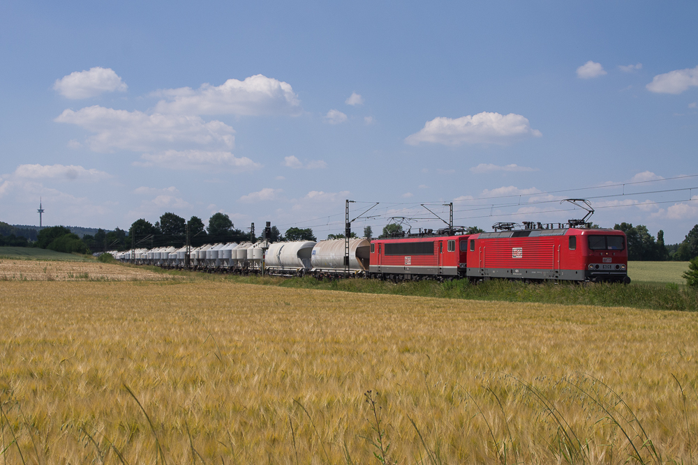 MEG 605 (143 344) und 704 (155 195) mit Zementzug von Rüdersdorf (bBerlin) nach Regensburg am 19.07.2013 bei Seubersdorf an der KBS 880 Nürnberg-Regensburg.