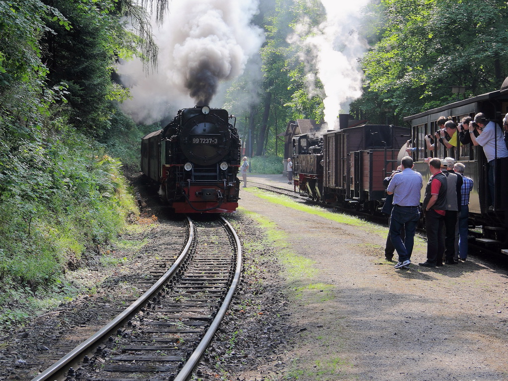 Eisfelder Talmühle, Ausfahrt 99 7245-6 mit HSB 8904 nach Wernigerode und 99 5906-5 mit dem Sonderzug 89102 am 13. Juli 2013.