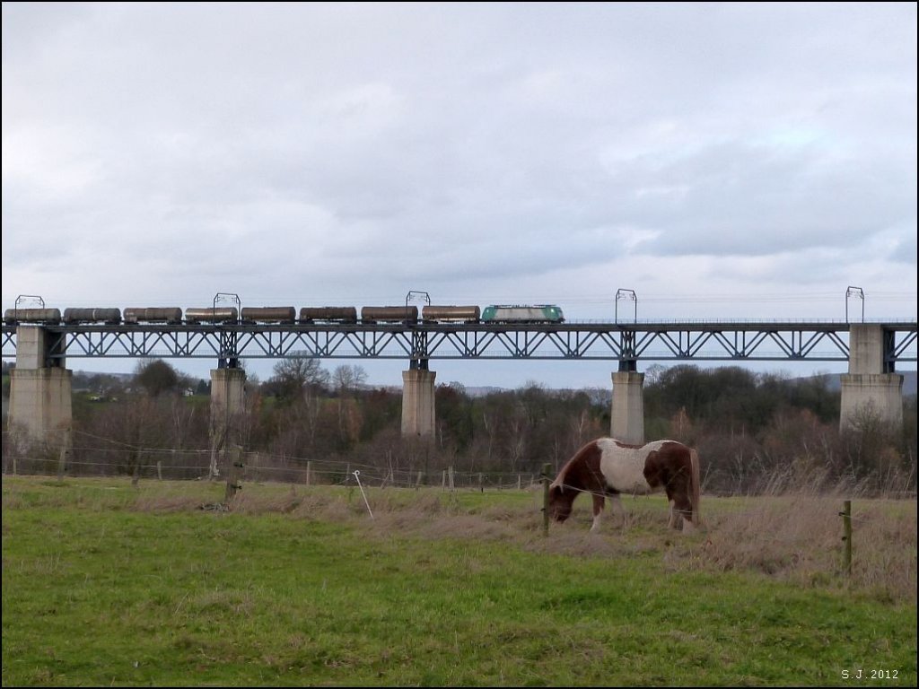 Zugbegegnung am Göhltalviadukt.Die Class 66 macht sich mit ihrer Güterfracht auf in Richtung deutsche Grenze nach Aachen. Bildlich festgehalten im November 2012.