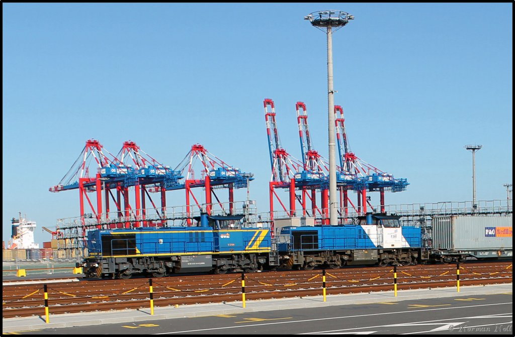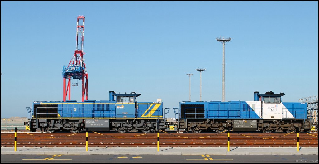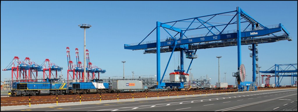 V 2104 der EVB und 500 1836 der Duisport Rail stehen am Jade-Weser-Port und warten auf die Abfertigung Ihres Containerzuges. Wilhelmshaven 20/07/2013
