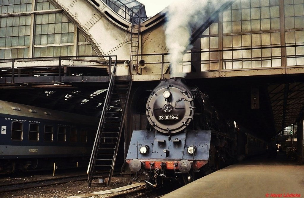 03 0019-4 vor einem Schnellzug nach Stralsund im Berliner Ostbahnhof (Oktober 1978)