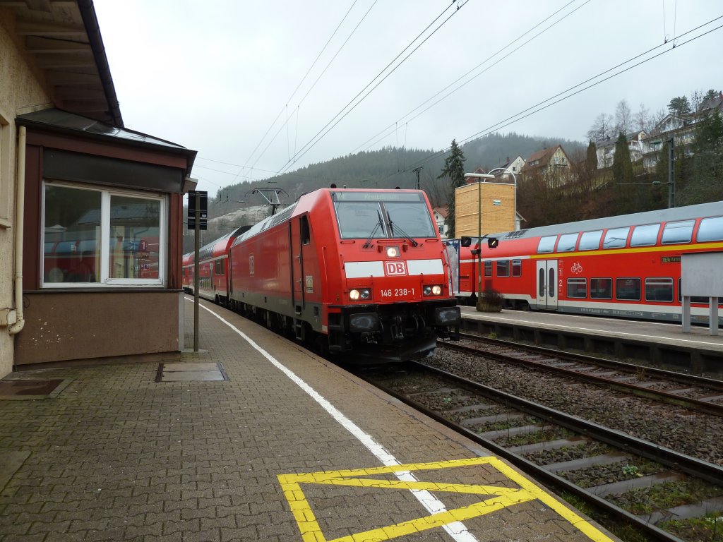 146 238-1 mit einem IRE nach Kreuzlingen am 21.01.12 bei der Ausfahrt aus Hornberg.