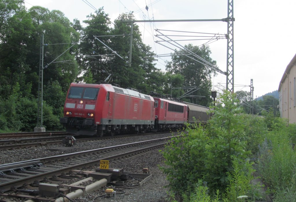 185 049-4 zieht am 09. Juli 2013 eine 155er und einen H-Wagenzug durch Kronach.