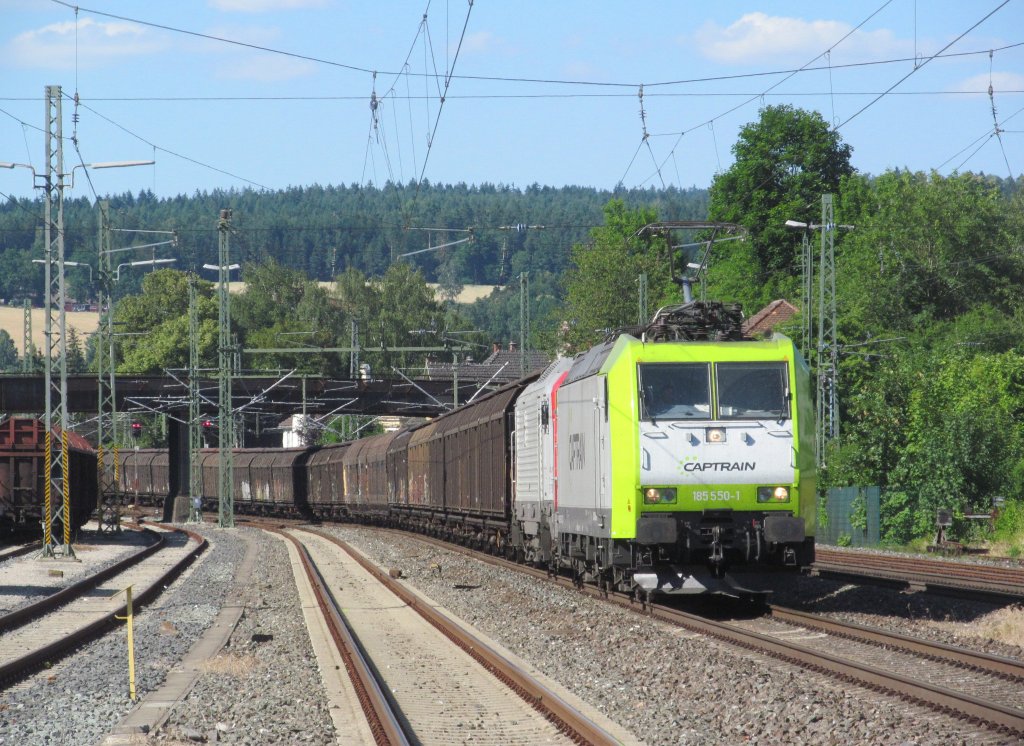 185 550-1 von Captrain zieht am 21. Juli 2013 die E 37 531 von Akiem und einen H-Wagenzug durch Kronach in Richtung Lichtenfels.
