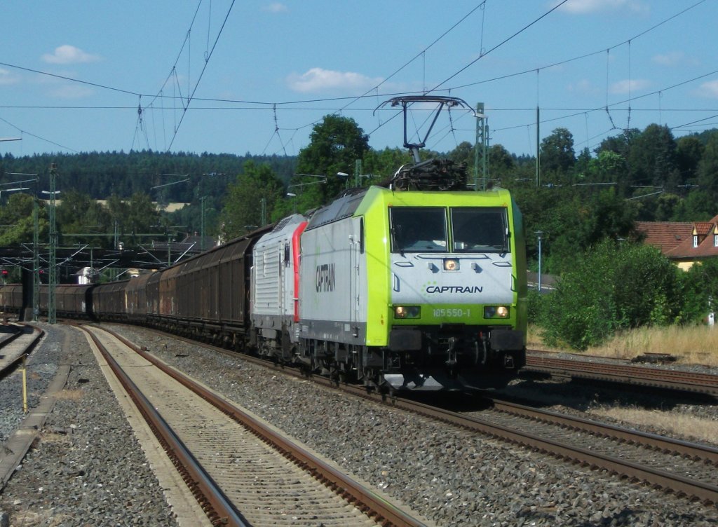 185 550 von Captrain zieht am 21.Juli 2013 eine Akiem E37 und einen H-Wagenzug nach Fohrbach durch Kronach Richtung Lichtenfels.