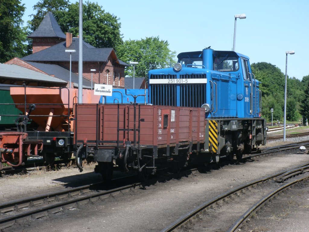 251 901 stand mit einem Ow an der Lokübergabestelle,am 20.Juli 2013,in Putbus.