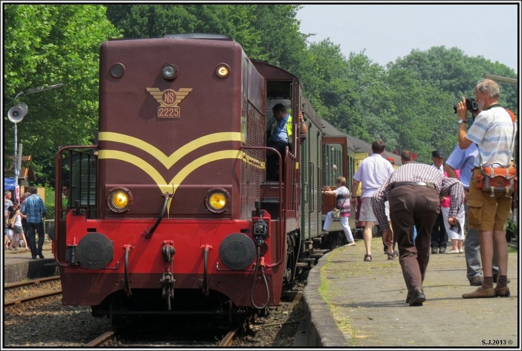 Die Gastlok 2225 mit einen Sonderzug am Haken steht abfahrbereit am Gleis.
