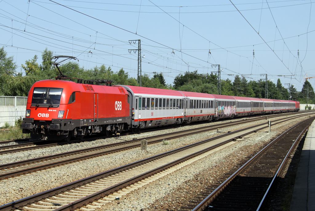 Die 1016 045 fährt im Sandwich einen EC nach Frankfurt durch Olching am 16.07.2013
