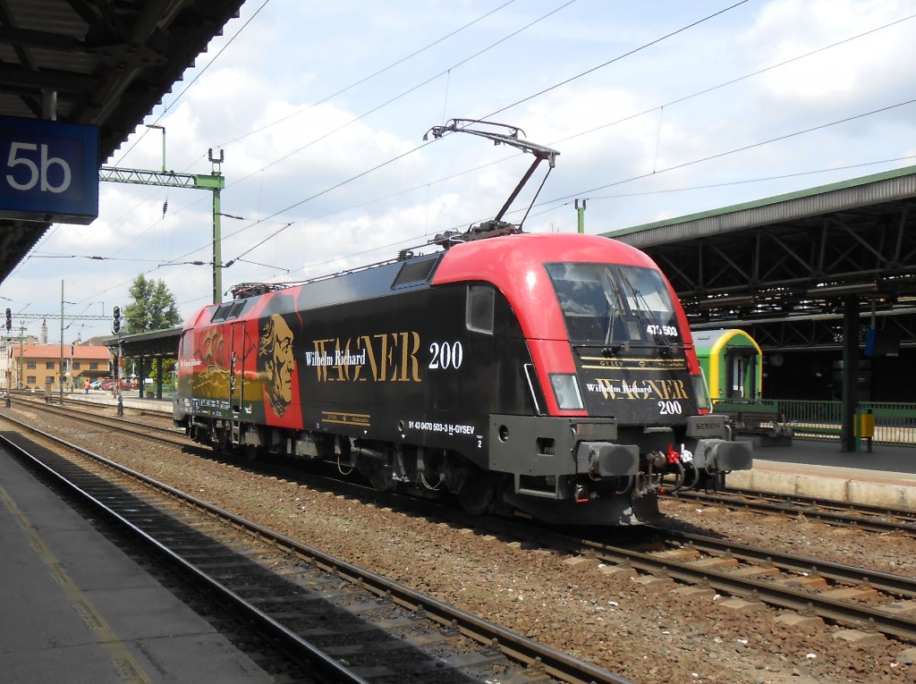Die neueste Werbelok der Raaberbahn hört auf den Namen "Richard Wagner" und erinnert an den 200. Geburtstag des berühmten Komponisten. Sie entstand durch Entkleben und Neubekleben der Werbelok "Franz Liszt", deren Folien sich bereits in einem sehr erbärmlichen Zustand befanden. Nachdem sie am 20.7.2013 einen Zug von Budapest keleti nach Sopron gebracht hatte, fuhr sie auf dem mittleren der drei Gleise durch den Bahnhof.