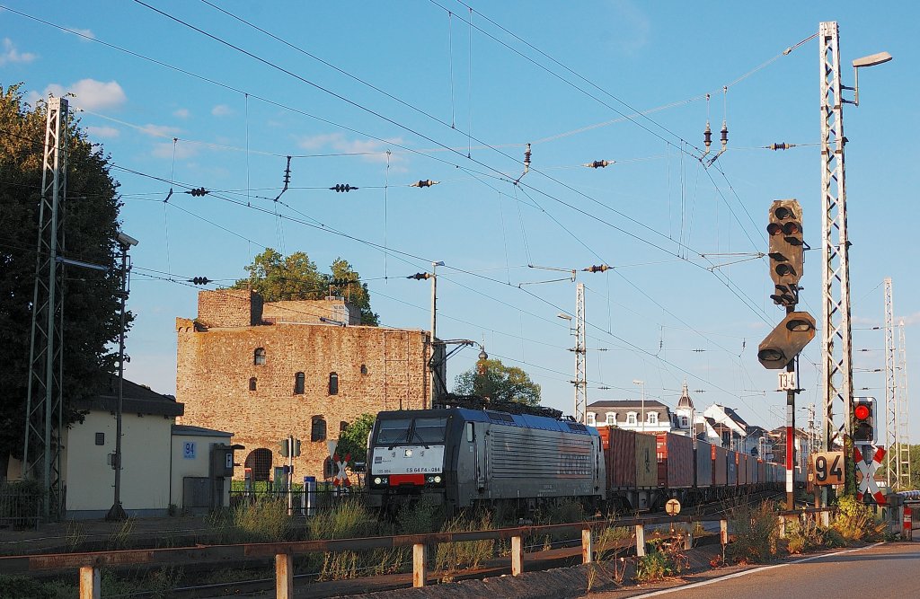 Durch Rüdesheim rheinabwärtsfahrend kommt am Freitagabend die MRCE / LOCON 189 984 mit einem Containerzug. Hier ist sie im Bahnhofsbereich abgelichtet 19.7.2013