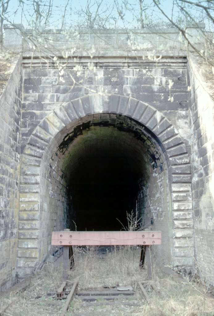 Frankreich, Lothringen, auf der Strecke Audun-le-Tiche (Moselle) - Rédange (Moselle) - Rédange-Adlergrund (Moselle) - Hussigny (Meurthe-et-Moselle) - Longwy (Meurthe-et-Moselle). Geschlossener Tunnel (462m) auf der Teistrecke Haltestelle Rédange - Rédange Adlergrund. Die Strecke Audun-le-Tiche - Rédange Adlergrund wurde am 1.4.1880 in Betrieb genommen, die Personenzüge fuhren bis zum 15.5.1937, die Güterzüge, vor allem Eisenerzzüge, fuhren bis zum 31.7.1987 auf der Teilstrecke Audun-le-Tiche - Rédange. Scan eines Dias von Anfang 1976.