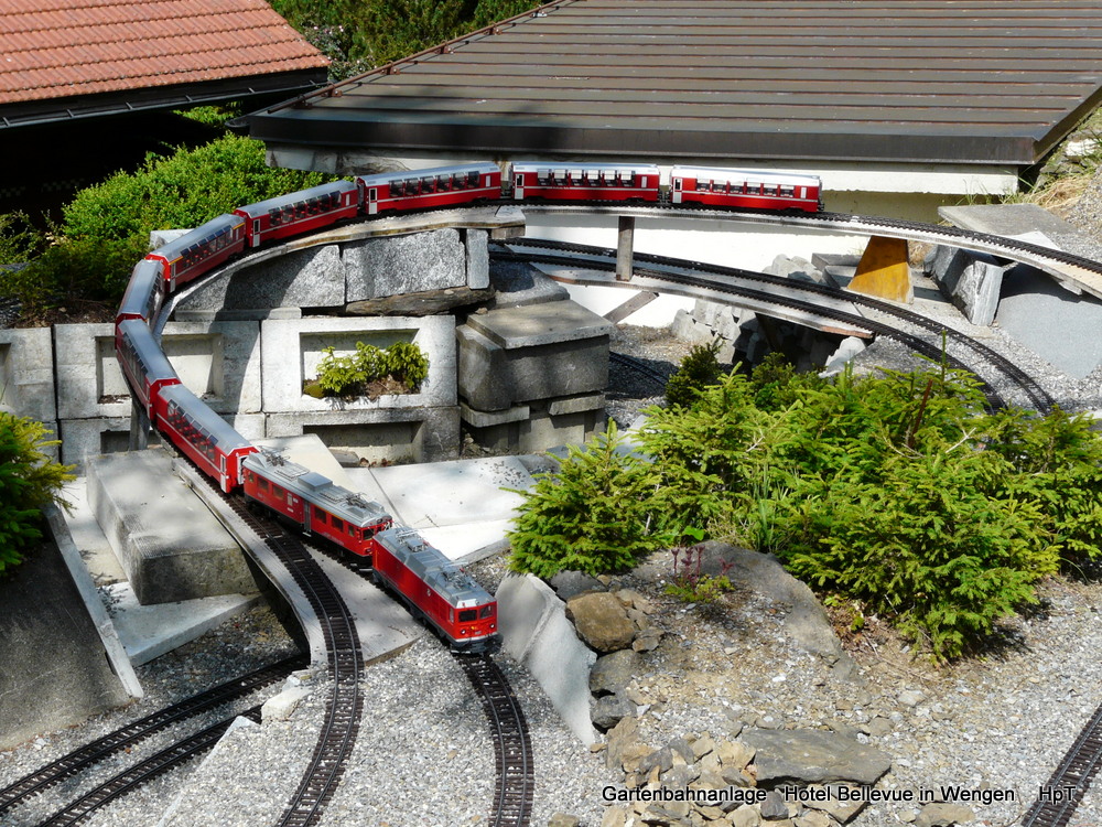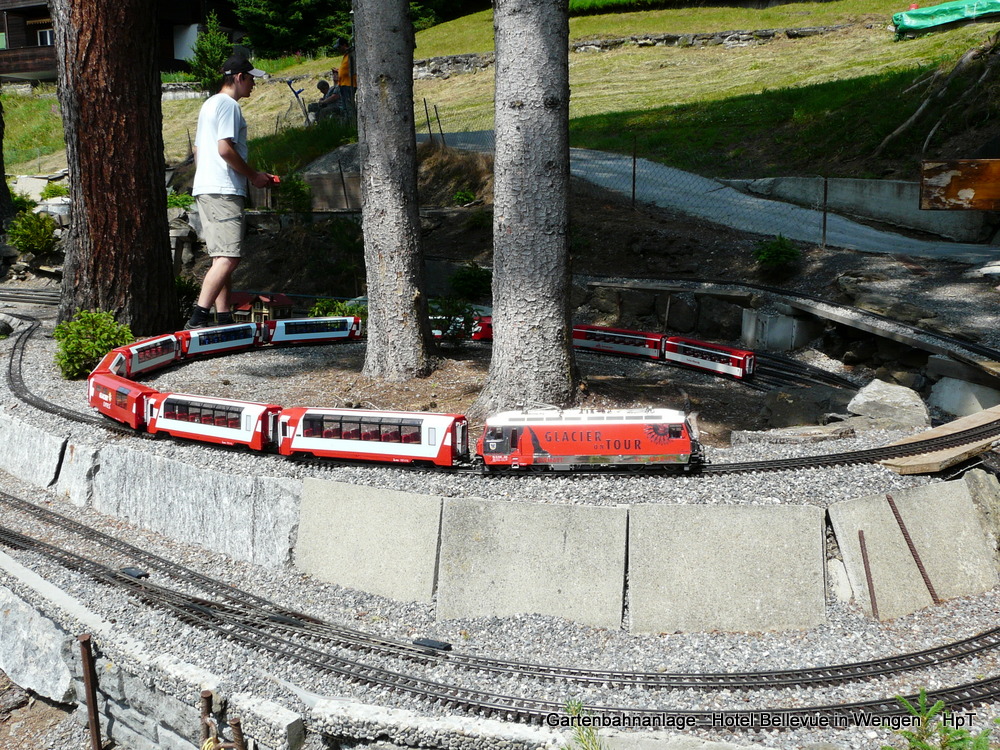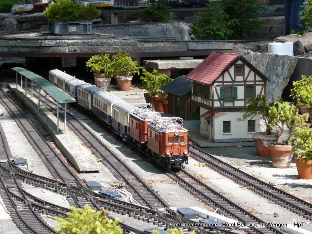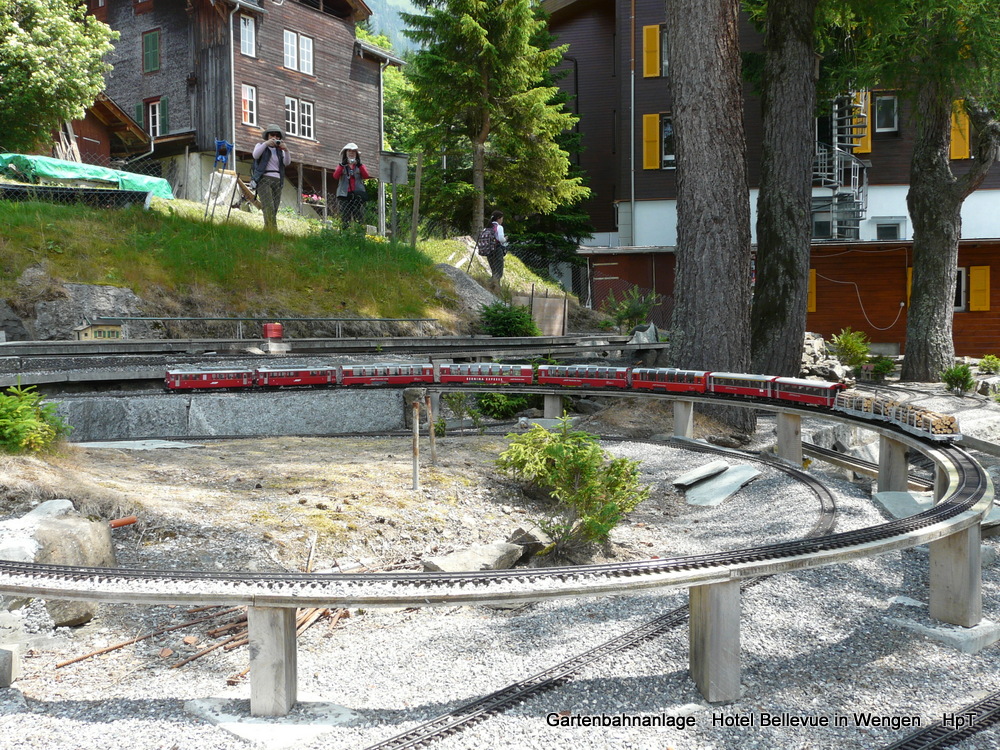 Gartenanlage Hotel Bellevue in Wengen - 2 LGB Loks mit Personenzug unterwegs am 13.07.2013