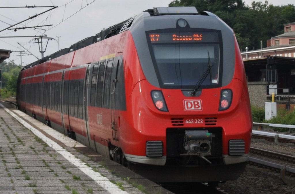 Hier 442 322-4 als RE7 (RE18711) von Wünsdorf-Waldstadt nach Dessau Hbf., bei der Einfahrt am 28.6.2013 in Berlin Wannsee.