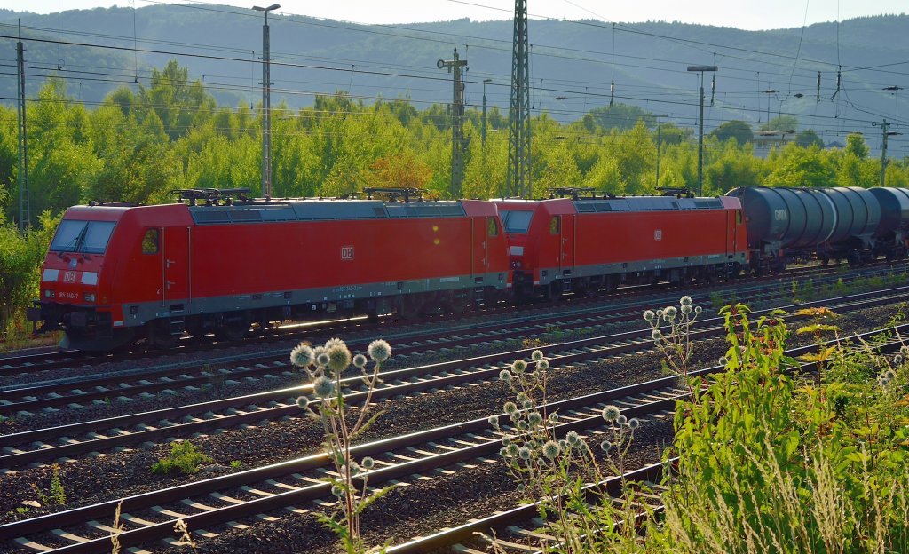 In Oberlahnstein kalt abgestellt stehen die beiden 185 340-7 und 368-8 mit einem Tankwagenzug. 21.7.2013