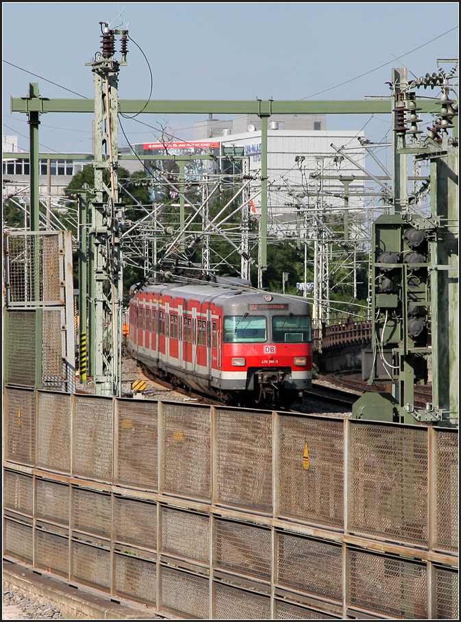 Eine S-Bahn aus Richtung Ludwigsburg wird gleich in den S-Bahntunnel am Stuttgarter Hauptbahnhof abtauchen. Durch die Verlegung der Bahnsteige nach hinten, kommt man jetzt in früher unzugängliche Bereiche des Gleisvorfeldes. Leider ist die Tunnelrampe hoch eingezäunt, so sind hier nur bedingt Aufnahmen möglich.
