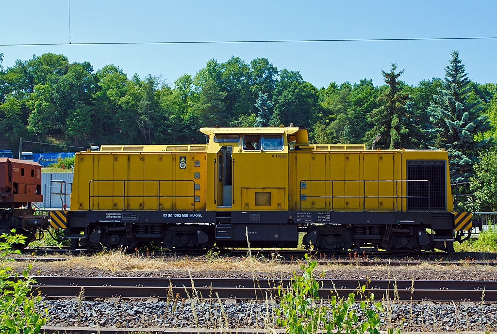 V 150.03, ex DR 110 963-6, ex DR 710 963-0, ex DB 710 963-0 (eine ehem. DR V 100.5) der SGL Schienen-Güter-Logistik GmbH mit Zweiseitenkippwagen Typ Fas (diese wurden gerade mit Kies beladen) am 20.07.2013 beim Bahnhof Sinn (Lahn-Dill-Kreis) an der KBS 445 (Dillstrecke).