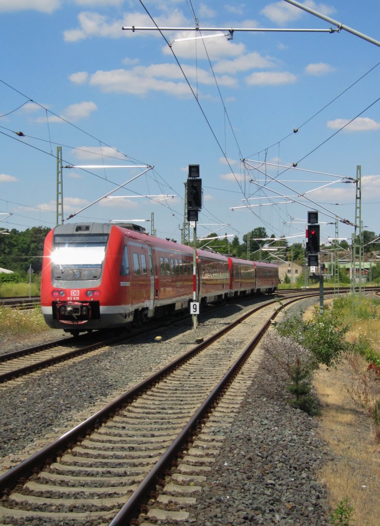 22.7.2013 12:01 DB AG 612 628 sowie ein weiter Triebzug der Baureihe 612 als RE aus Dresden Hbf nach Nürnberg Hbf bei der Ausfahrt aus Plauen (Vogtland) Oberer Bahnhof.