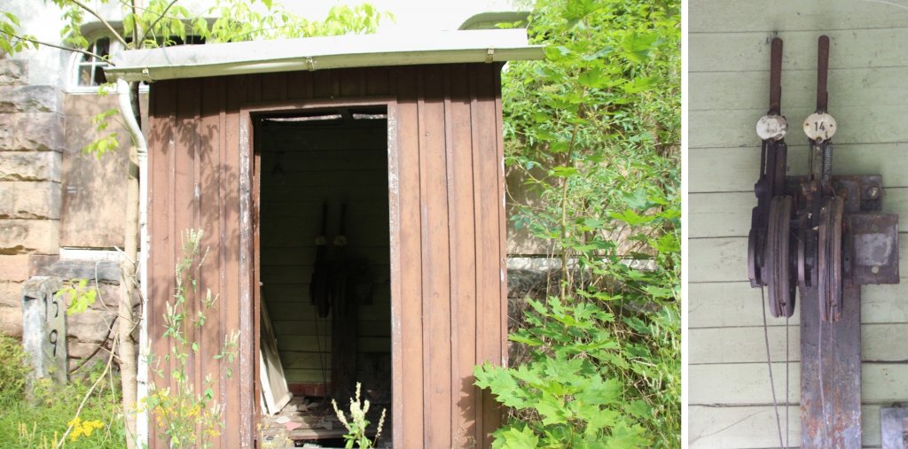24.7.2013 Am Empfangsgebäude Rauenstein. Weichenhebel und Kilometerstein am verlassenen EG.