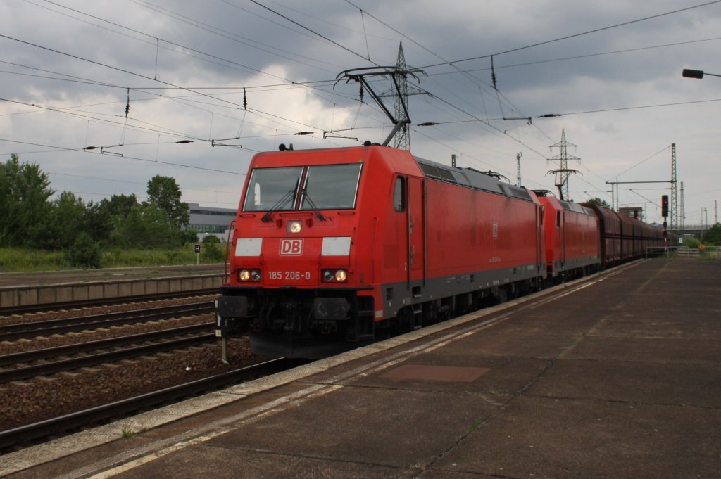 Hier 185 206-0 und 185 235-9 mit einem Schüttgutwagenzug, bei der Durchfahrt am 28.6.2013 durch Berlin Schönefeld Flughafen, in Richtung Genshagener Heide.
