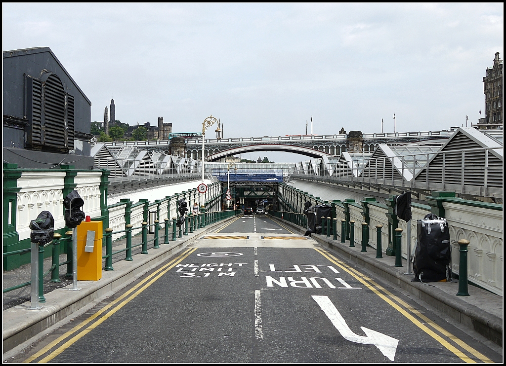 Ungewöhnlich: in U-Form führt eine Straße direkt zu den Bahnsteigen - hier die linke Seite des U. Edinburgh-Waverley, 13.7.2013