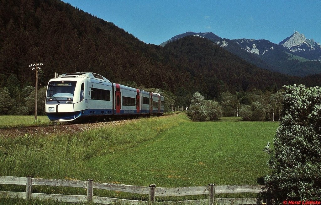 VT 111 der BOB im Juli 2003 kurz vor dem Bahnhof Fischbachau