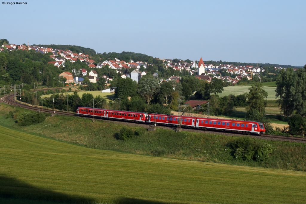Zwei Triebwagen der Baureihe 611 verkehrten am 16.07.2013 als IRE 4239 von Lindau über Ulm nach Stuttgart und konnten dabei bei Lonsee fotografiert werden. Das Duo musste wahrscheinlich für einen Dosto-Zug einspringen, denn normalerweise werden auf dieser Linie Doppelstockwagen eingesetzt.