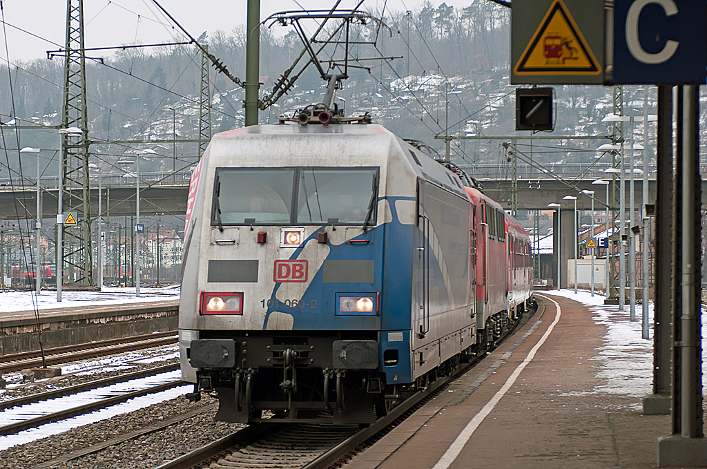 101 018 ist mit dem IC 119 nach Innsbruck HBF unterwegs auf der Filsbahn.Der Zug Eilt mit ca.+20 min. seinem nächsten Halt Göppingen entgegen bei Ebersbach(Fils)am 27.7.2013