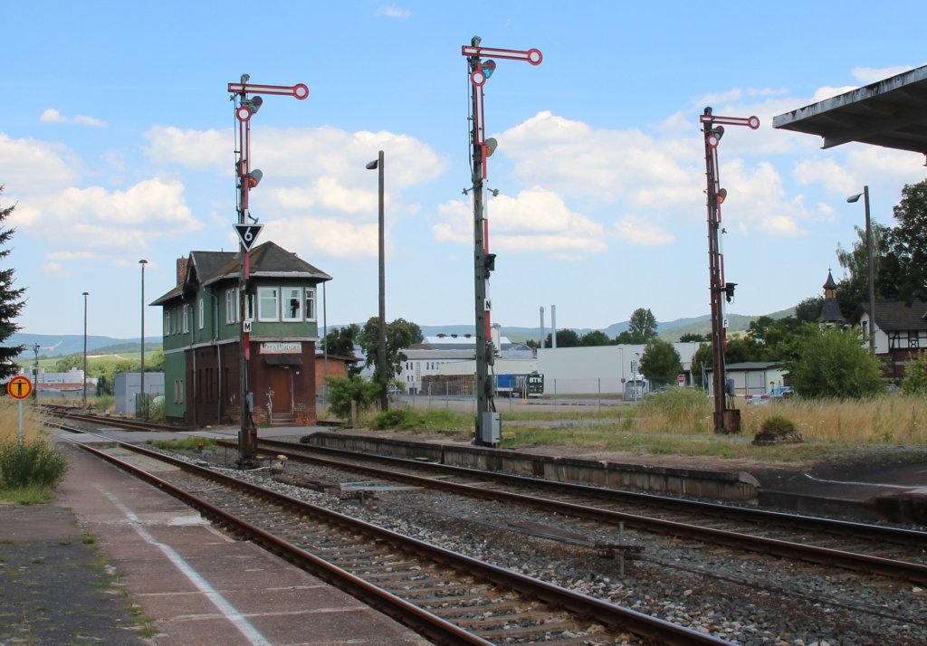 22.7.2013 Wernshausen. 2 Min Aufenthalt beim Kreuzen der Süd-Thüringen-Bahn lässt ein schnelles Bild auf Stellwerk und die Formsignale Ri Eisenach zu.