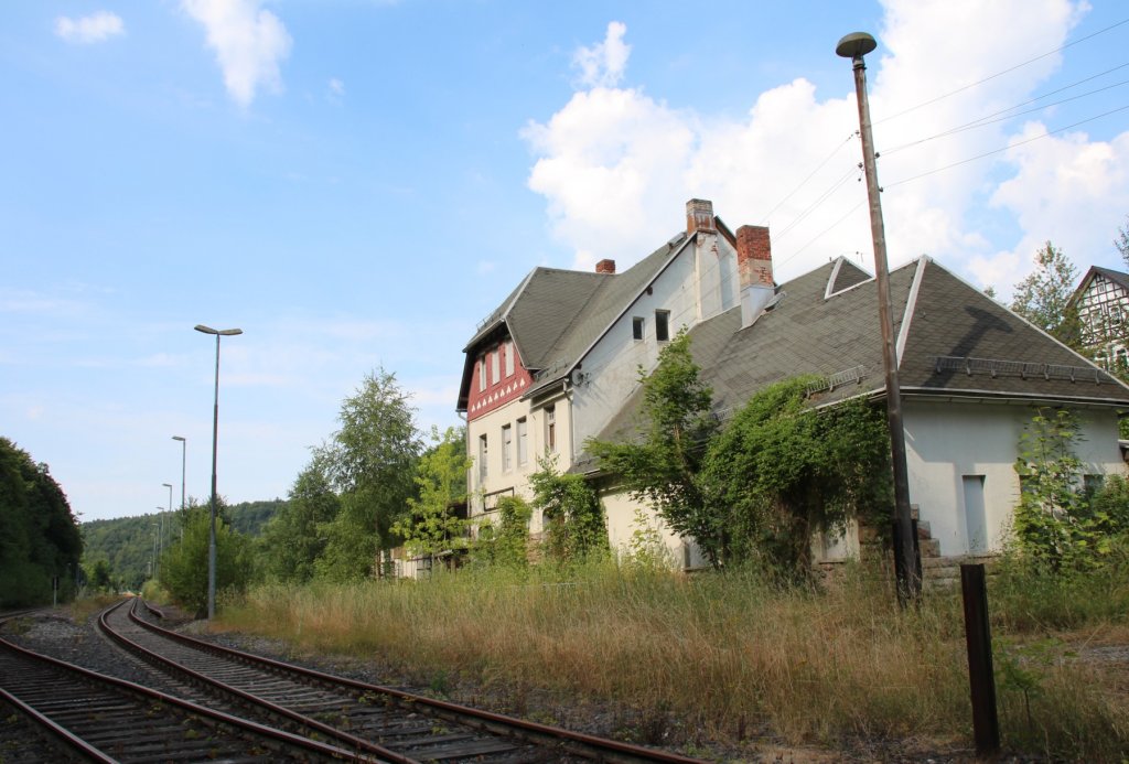 23.7.2013 Rauenstein, ungenutztes und verfallendes Empfangsgebäude. Wozu verkaufen oder instandhalten, wenn MNL (mobility, networks, logistics) es auch verfallen lassen kann? Oder indirekte Jugendarbeit für zukünftige Off-Road-Kids? (Breitstellen von Räumlichkeiten zum Ausleben der Zertsörungswut) Kategorie stillgelegte Bf trifft nur auf das EG zu.