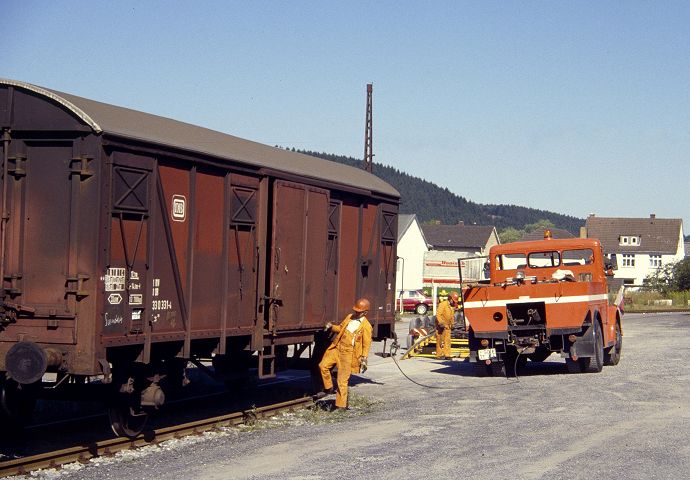 Abladen eines G-Wagens vom Straßenroller in Sundern, aufgenommen am 30.08.1991