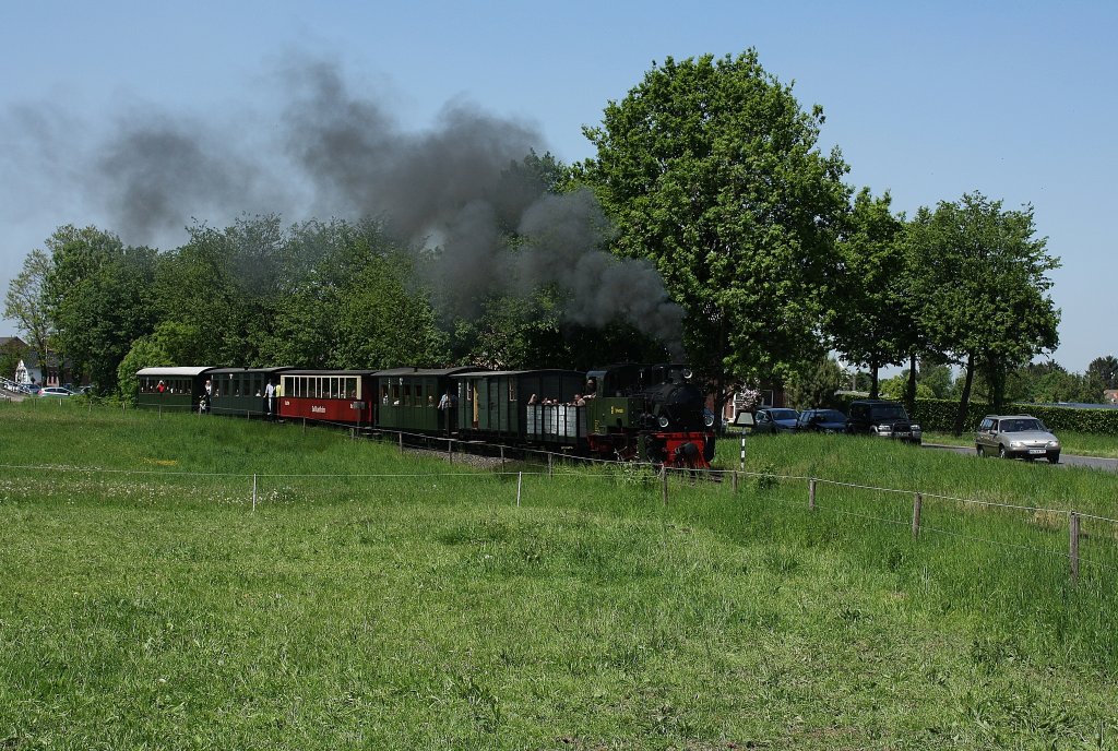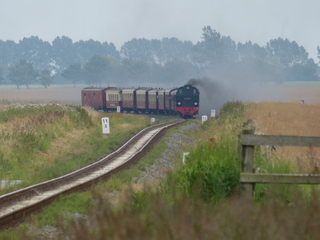 Das Dampfross 99 2323-6 schnaubt unüberhörbar über die Felder an der Ostseeküste. Nächster Halt ist Kühlungsborn Ost. 26.7.2013