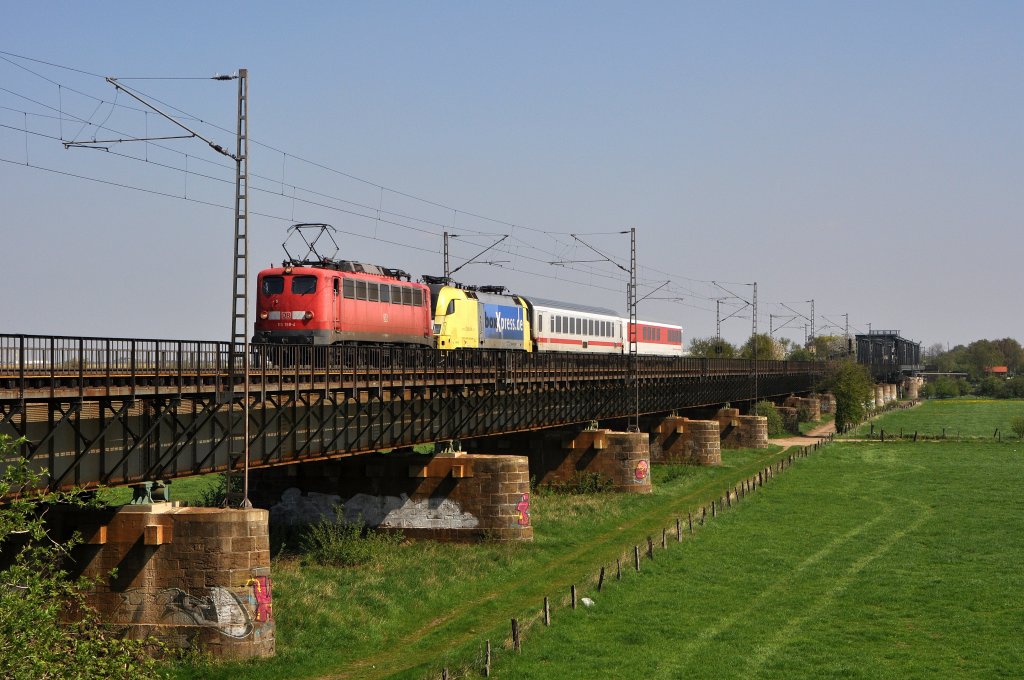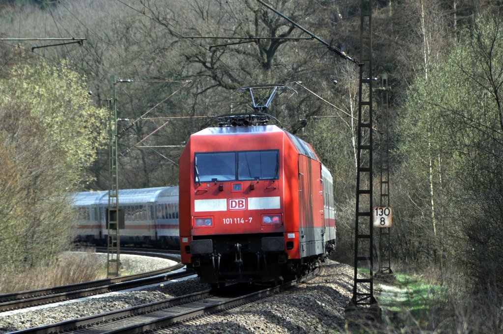 DB Fernverkehr 101 114 schiebt IC 1122 Frankfurt (Main) Hbf - Kiel Hbf am 21.04.13 mit gedrosselter Geschwindigkeit zwischen Vehrte und Ostercappeln durch die engen Kurven des Wiehengebirges, bevor einige Kilometer weiter nördlich richtig "Gas" gegeben werden kann.