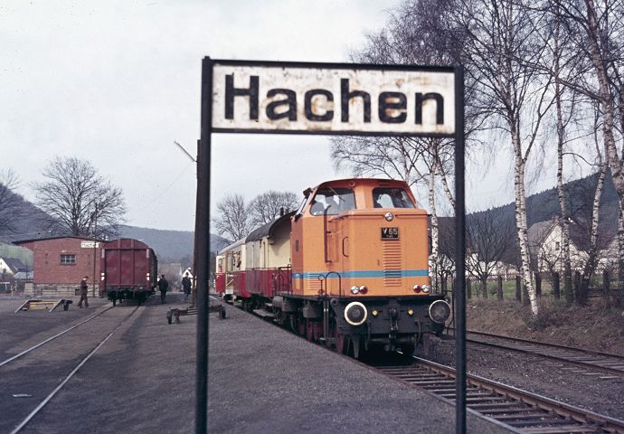 Ein Bild aus meiner Sammlung - Vermutlich eine Sonderfahrt Anfang der 70-er Jahre, die über die Röhrtalbahn nach Sundern führte. Das Bild entstand im Bf. Hachen. (Slg. Schmoll)