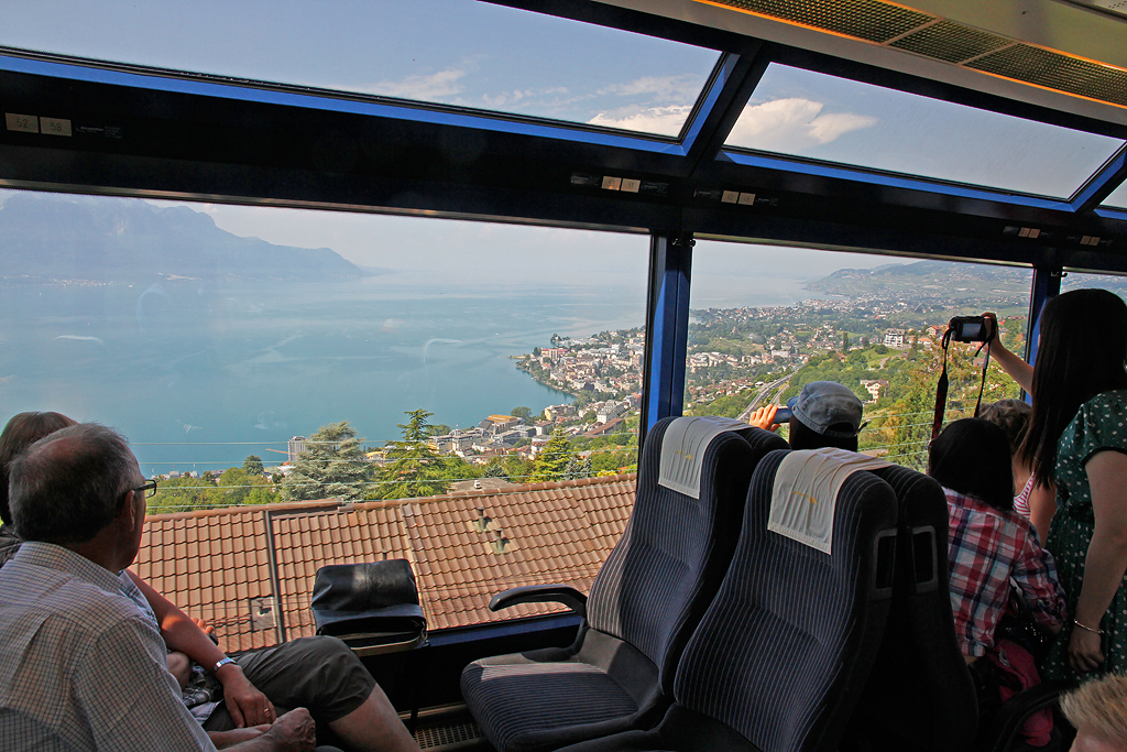 Im MOB-Panoramic-Express geht es die Steilrampe hinunter zum Genfersee. Aufnahme oberhalb Montreux, mit Blick nach La Tour-de-Peilz, Vevey und den Lac Léman am 22. Juli 2013, 12:08