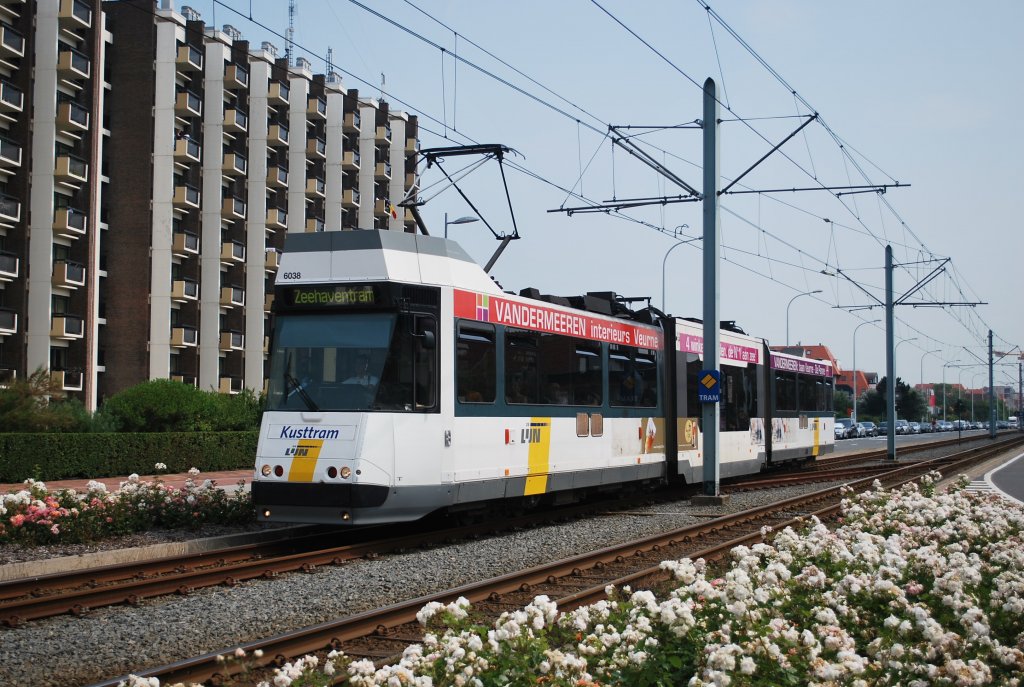 Kusttram (BN Nr.6038) Knokke-De Panne auf der Albertlaan in Nieuwpoort (Juli 2013).