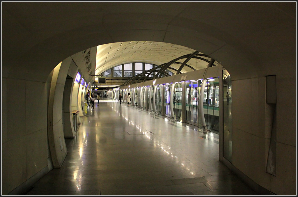 Die Bahnsteigebene mit den für die Pariser Metro-Linie 14 typischen Stahlbögen als architektonisch wirksames Element der Bahnsteigtürenkonstruktion.
