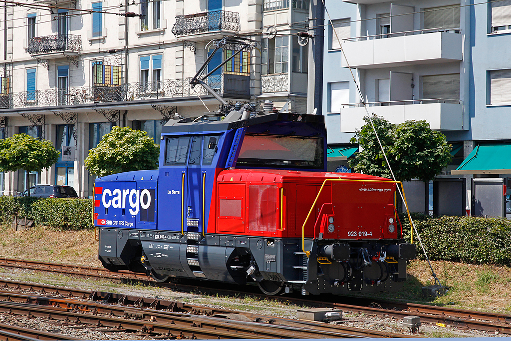 SBB Eem 923 endlich mal vor meiner Linse. Das zweiachsige Kraftpaket von Stadler entwickelt 1500 kW (290 kW bei Dieselbetrieb) und eine Anfahrzugkraft von 150 kN. Das Ding mit Achsfolge Bo rast mit 100 km/h und würde auch noch 120 km/h schaffen. Aufnahme in Fribourg, 21. Juli 2013, 12:03