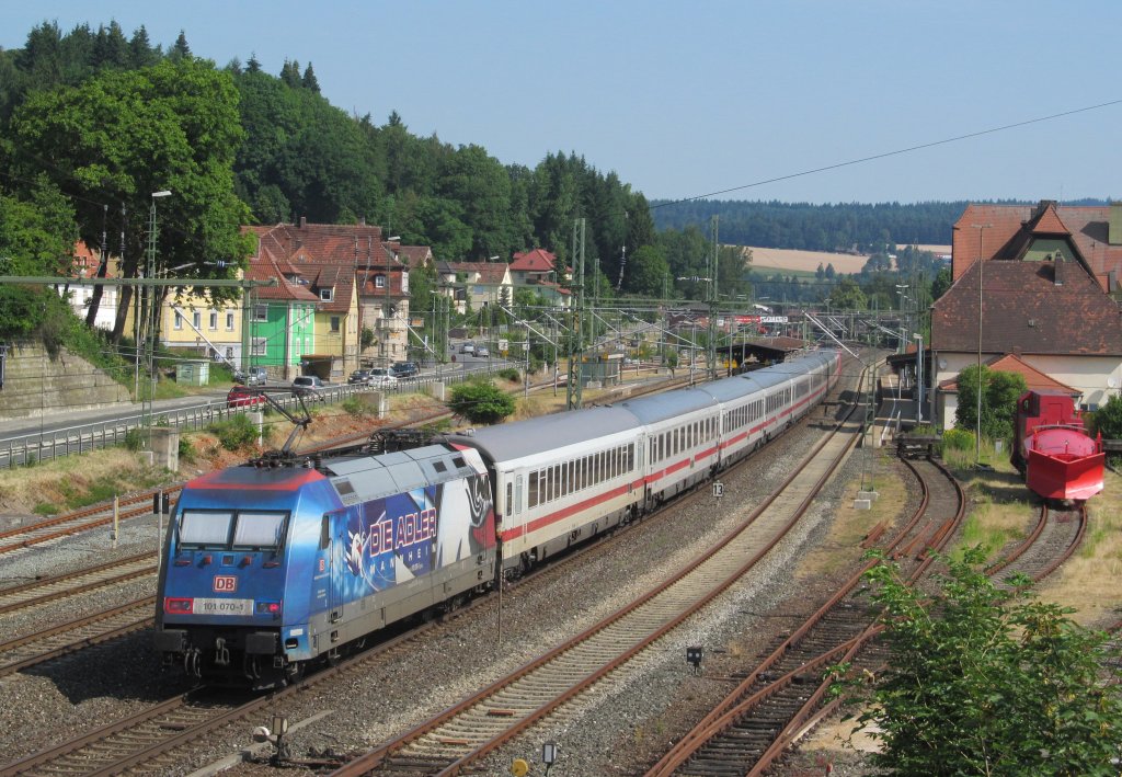 101 070-1 "Adler Mannheim" schiebt am 27. Juli 2013 den IC 2208 durch Kronach.