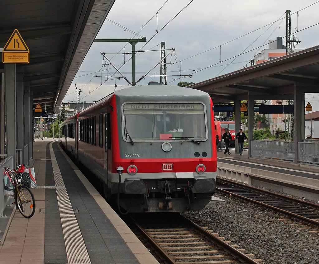 Am 22.05.2013 stand 928 444 mit einer weiteren Einheit am Bahnsteig in Worms Hbf.