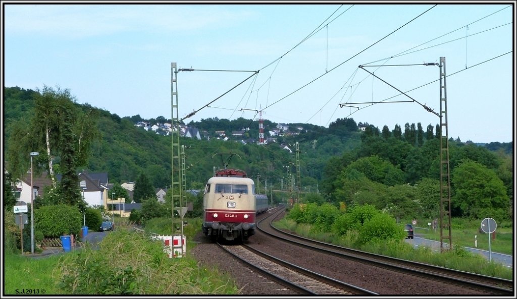 Auch mit der Weitwinkeloptik macht die 103 235-8 eine gute Figur.Hier zu sehen im regulären Plandienst mit einen IC am Haken bei Erpel am Rhein im Juni 2013.