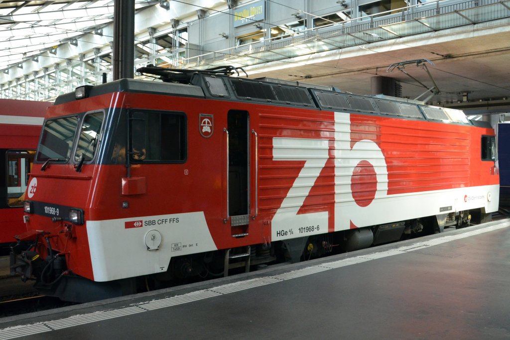 E-Lok HGe 4/4 101968-9 Zahnrad-E-Lok - Baujahr 1990. Sie trägt den Namen ,,Ringgenberg“ der Schweizer Zentralbahn im Bahnhof Luzern am 18.06.2013.