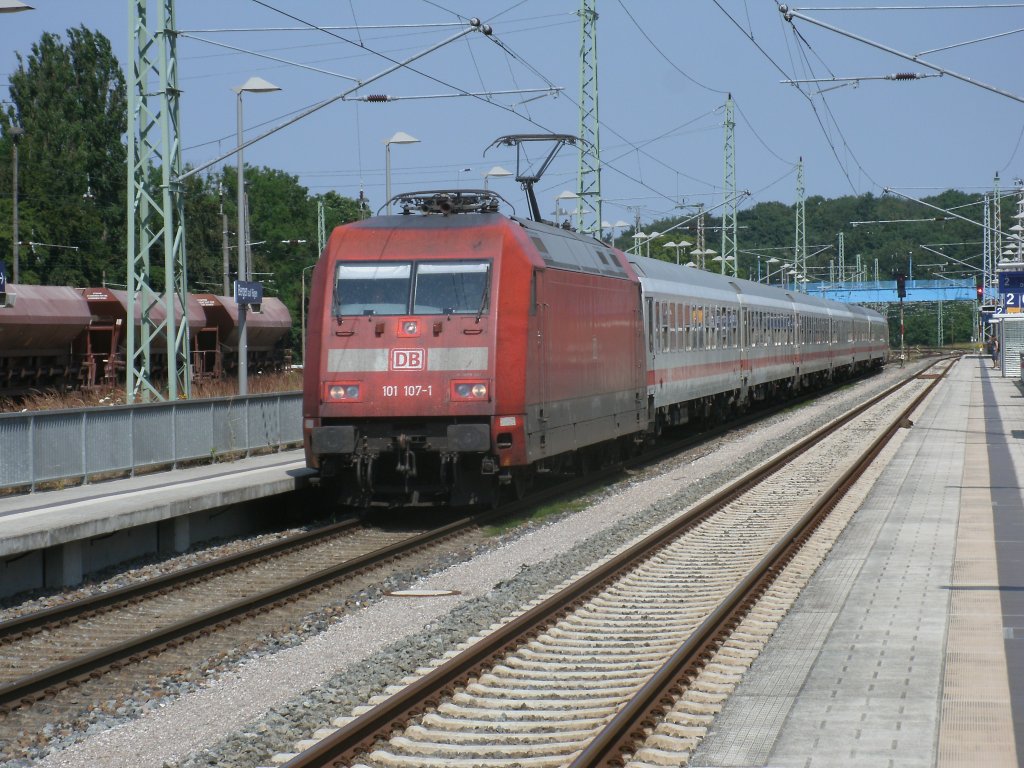 Mit dem Lr 78563 Binz-Stralsund(und 110 469 am Schluß)fuhr 101 107,am 27.Juli 2013,ohne Halt durch Bergen/Rügen.101 107 kam Stunden später mit dem EC 378 Bratislava-Binz noch einmal,am 27.Juli 2013 nach Rügen.
