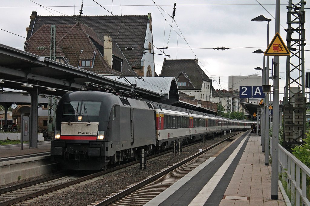 MRCE/DB Fernverkehr ES 64 U2-070 mit dem EC 6 am 22.05.2013 bei der Durchfahrt durch Worms.