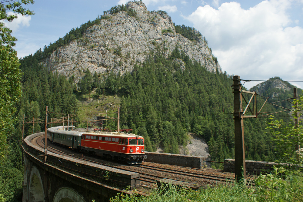 1042.23 mit einem Sonderzug von Wien FJB nach Mixnitz-Bärenschützklamm beim Überqueren der Kalten Rinne (Semmeringbahn). Aufgenommen am 20. Juli 2013